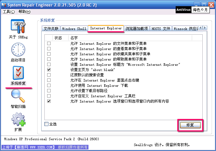 這里列出了常見的一些和IE相關的限制項目,勾選需要修復的項目,點擊“修復”按鈕進行修復。