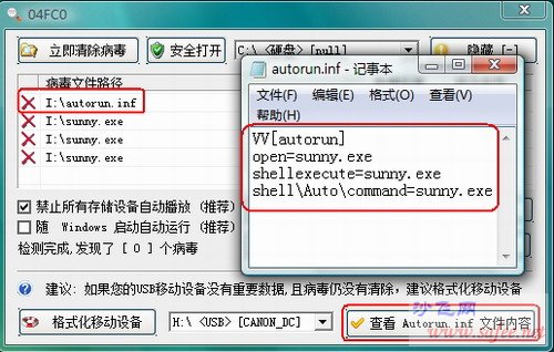 Windows95以后的系統都有一個“自動運行”的功能。通過在卷插入時讀取磁盤卷上的Autorun.inf文件來獲得Explorer中卷的自定義圖標和對卷圖標的上下文菜單進行修改,并對某些媒體自動運行Autorun.inf中定義的可執行文件。05年以后,隨著各種可移動存儲設備的普及,國內有些黑客制作了盜取U盤內容并將自身復制到U盤利用Autorun.inf傳播的病毒。著名的偽ravmon、copy+host、sxs、Viking、熊貓燒香等著名病毒都有這種傳播方式。它們有時是根目錄下的神秘幽靈,有時是出現在不應該出現的地方的回收站,總之,它們是系統安全的嚴重威脅。見圖0、圖1。