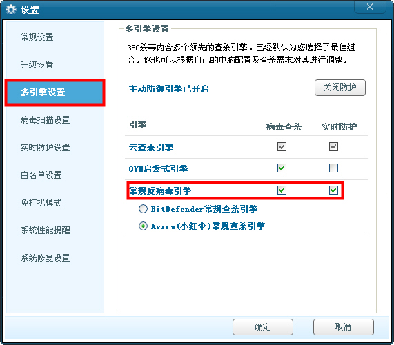 360殺毒3.0版本默認不安裝本地引擎病毒庫,如果您想使用本地引擎,請點擊主界面右上角的"設置",打開設置界面后點"多引擎設置",然后勾選上常規反病毒引擎查殺和防護,您可以根據自己的喜好選擇Bitdifender或Avira常規查殺引擎,選擇好了之后點確定按鈕: