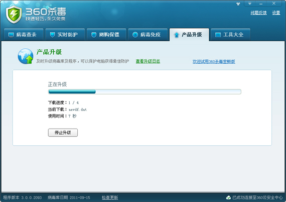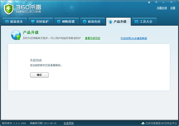 360殺毒具有自動升級功能,如果您開啟了自動升級功能,360殺毒會在有升級可用時自動下載并安裝升級文件。自動升級完成后會通過氣泡窗口提示您:
