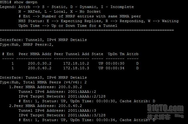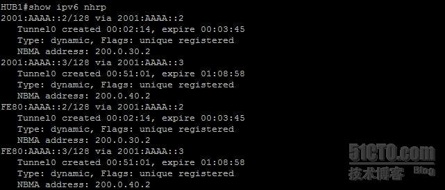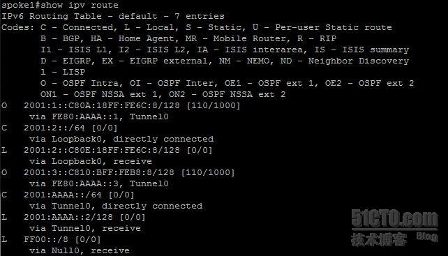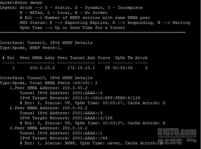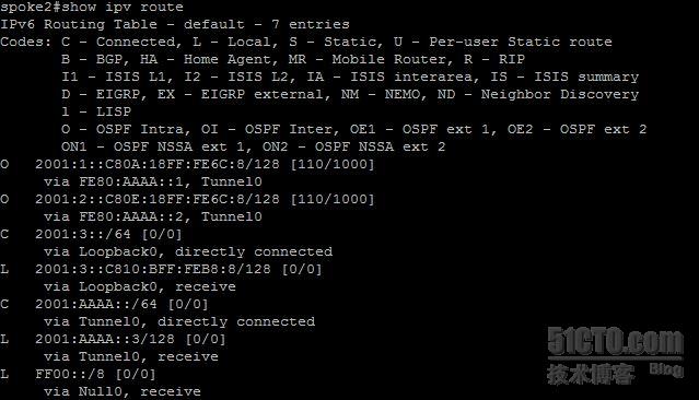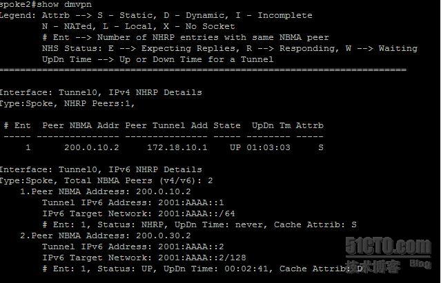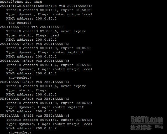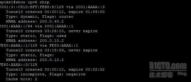 查看ipv6 nhrp 條目情況,一切正常;同時可以看到spoke與spoke之間已經建立動態路徑,可以直接進行通信,減輕hub負載。