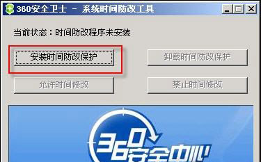 我們可以下載一些優化軟件,例如優化大師、360安全衛士等,都有對時間保護的設置,我們只需要對其進行具體的設置即可。下面是360安全衛士對系統時間的保護工具,我們點擊“安裝時間改防保護”即可。這時候,我們就不能隨意更改時間了,如果需要手動更改時間,那么我們需要點擊下面的“允許時間修改”即可。