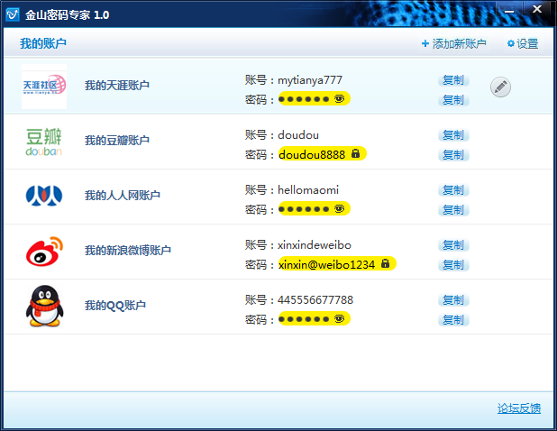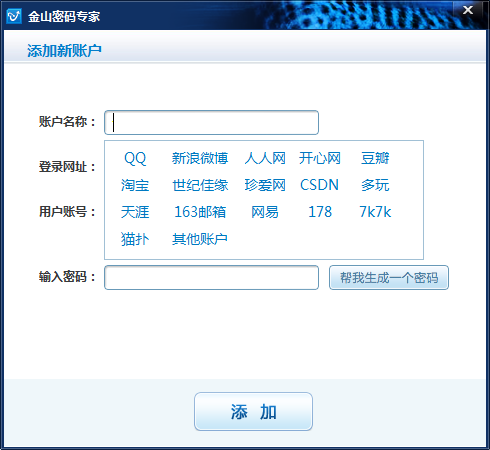 輸入密碼后,就可以添加上網(wǎng)賬號(hào)了。密碼專家準(zhǔn)備了網(wǎng)民常用的網(wǎng)站,如QQ、新浪微博、SNS網(wǎng)站等。用戶直接點(diǎn)擊就完成了網(wǎng)站名稱和網(wǎng)址的輸入,省去了大量功夫。然后就輸入你該網(wǎng)站的賬號(hào)和密碼吧。