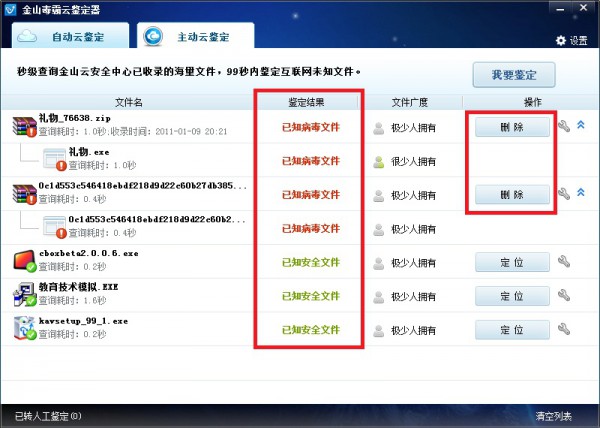進入“金山毒霸云鑒定器”窗口,切換到“主動云鑒定”選項卡,單擊“我要鑒定”,彈出“請選擇需要進行云鑒定的文件”窗口,找到并雙擊需要鑒定的文件,金山毒霸“云鑒定器”開始對文件進行安全性鑒定,稍等片刻就會作出判斷,并在“鑒定結果”欄顯示鑒定結果,文件是否安全一目了然,如果文件安全,綠色字體顯示,如果發現病毒文件,則會紅色高亮顯示,此時只要單擊“操作”欄中的“刪除”按鈕(如圖2),即可將其帶病毒的文件刪除,消除安全隱患,避免上當受騙,落入不法分子布下的陷阱。