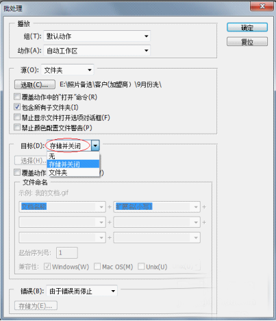 5、在目標 的設置的時候一定要注意,為了操作部繁瑣,使動作連續進行我們要選“存儲并關閉”意思就是說當我們的圖片每一張批處理完成以后就會自動的存儲并關閉了。