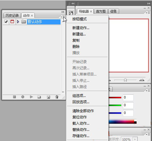 2、單擊動作面板右上角的箭頭彈出菜單,如下圖所示: