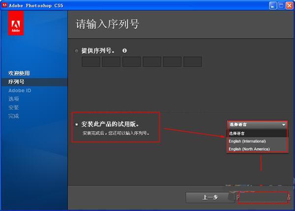 4、繼續選擇則安裝試用版,可進行語言的選擇,此后選擇“下一步”。