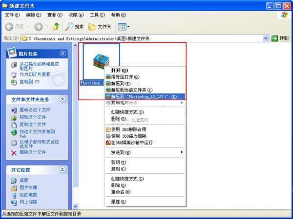 2、右擊壓縮包,選擇“解壓到‘Photoshop_12_LS1’”(如下圖所示)。解壓出一個與壓縮包名同名的文件夾。