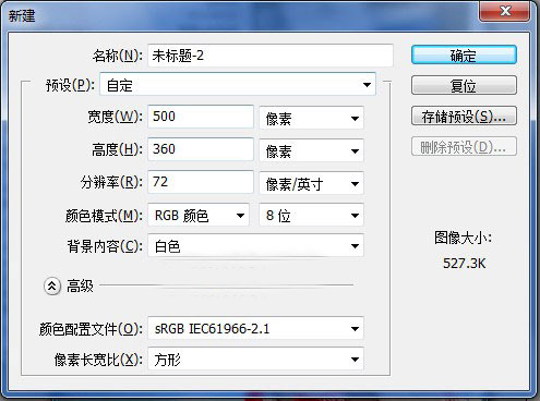 我們來學習何如創建一個新文檔。如果在Photoshop CS2中沒有打開一個文檔,那么它的任何工具和選項都是不能進行操作的,所以首先我們在“文件”菜單欄中選擇“新建”也可以按住Ctrl鍵的同時雙擊鼠標左鍵便會彈出一個新建文件對話框,我們設置寬為500像素,360像素高的文檔,這個大小對大多數顯示器的工作區都是合適的,如下圖所示: