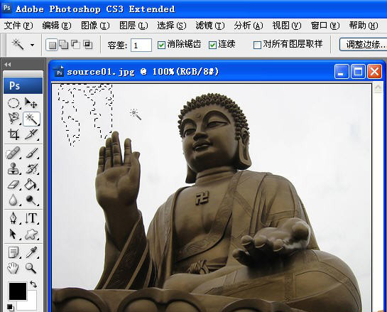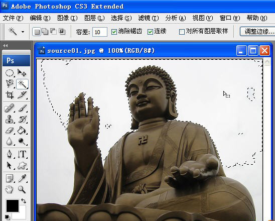 4、當把容差設置為10時,被選取的區域就明顯擴大了,不過還是不能把佛像外的區域都選中: