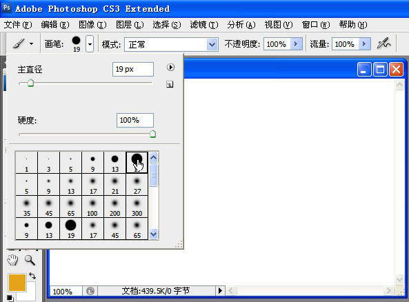 2、選中畫筆工具后,在菜單欄的下方會有畫筆的常用屬性,最常見的設置就是“主直徑”和“硬度”,一個決定了畫筆的大小,一個決定了畫筆的邊緣過渡效果: