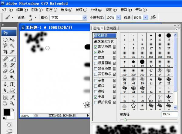 9、在這個畫筆的屬性里,可以進行很多的設置,比如“形狀動態”可以讓畫筆的形狀動畫變化,特別適用于不規則畫筆,“散布”可以讓畫筆隨機分布等等,我們將這兩者打勾,畫筆的效果就變成如下形態: