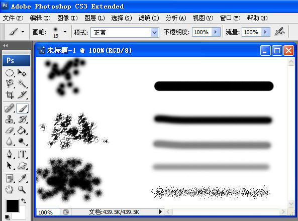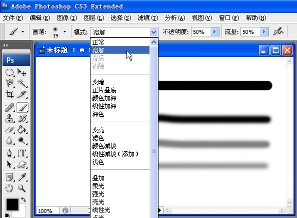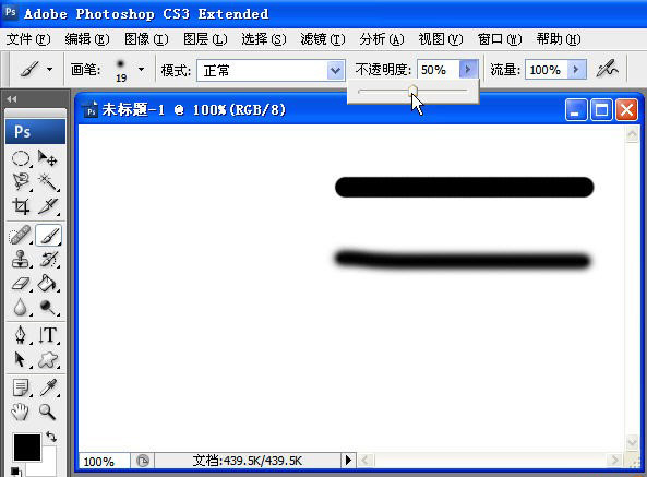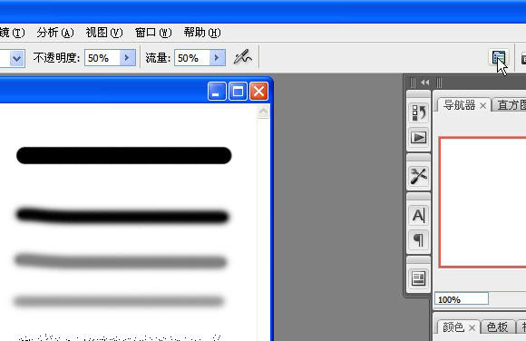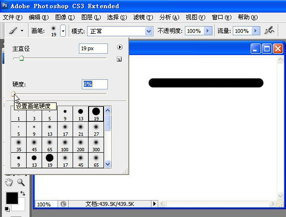 3、當畫筆的硬度為100%時,畫出的效果如下圖所示,之后我們將硬度調整為0%,如下圖所示:
