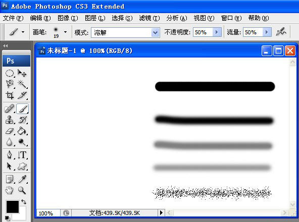 4、當畫筆的硬度調為0時,畫出的效果就有明顯的差別,如下圖所示:
