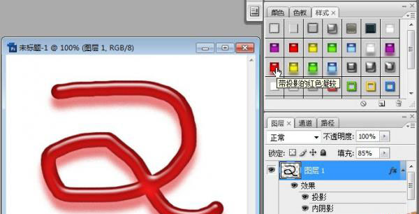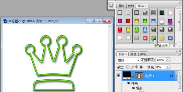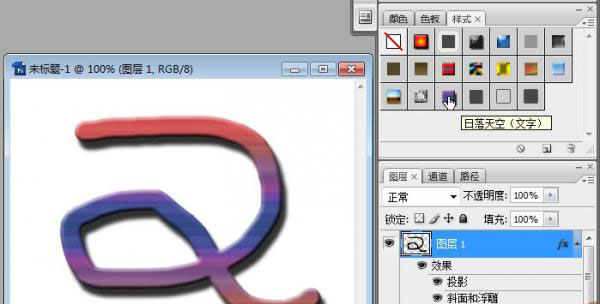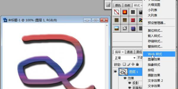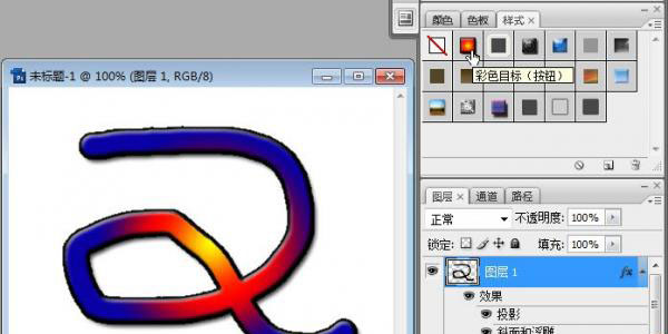 3、確保圖層1處于選中狀態,單擊選中一個現成的樣式,如下圖所示選中“彩色目標”,這時候就會發現樣式馬上就會起作用,同時在圖層1下方會顯示出相應的圖層樣式內容,如下圖所示: