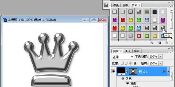 10、再單擊一個樣式“水銀”,馬上就可以得到一個銀光閃閃的水銀物體,非常的方便,所以掌握樣式的使用是學習ps不可缺少的基礎知識。
