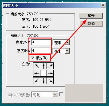 記得勾選【相對】,設置寬度和高度均為4毫米,然后點擊確定按鈕。