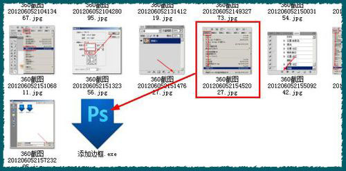 我們看到這個ps標志,將圖片拖動到該ps圖標就能自動的給圖片添加邊框,如果想要給多個圖片添加邊框,可以選中多個圖片,然后一起拖動到該圖標。
