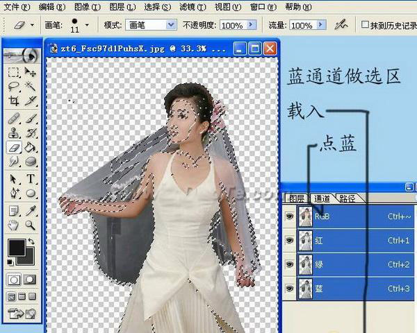 透明婚紗照摳圖處理教程:先需要用鋼筆等工具把人物部分摳出來包括婚紗部分。然后把摳出的人物圖層復制一層,在通道選區婚紗部分較為清晰的通道并調出選區,回到圖層面板后把選區反選按刪除高光部分以外的圖像,得到的圖像就是我們摳出的婚紗部分,后期再適當調亮即可。