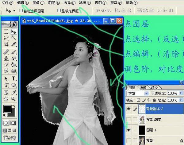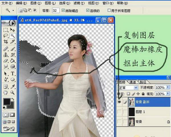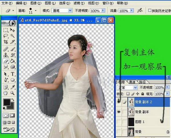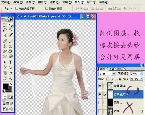 5、把背景副本2移到背景副本1下面,回到背景復制1圖層,用柔角橡皮工具擦去婚紗,然后合并可見圖層。