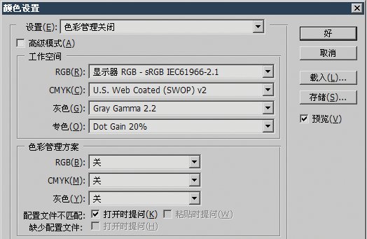 Photoshop有色彩管理功能,這主要用在印刷品制作上。我們目前針對網(wǎng)頁設(shè)計,因此可以選擇“顯示器顏色”,如下左圖。對于PhotoshopCS版本,可選擇“色彩管理關(guān)閉”,如下右圖。