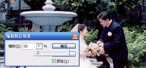 5.對圖層應用了多種樣式之后,就可以試一下“縮放效果”命令的用處了。選擇菜單命令“圖層|圖層樣式|縮放效果”,打開如圖5所示的“縮放圖層效果”對話框,可以在“縮放”右側的文本框中輸入縮放的比例,或者單擊向右箭頭,使用滑塊進行調整。由于默認情況下選中了“預覽”復選框,所以使用滑塊調整時可以實時觀察到圖層樣式的變化情況。