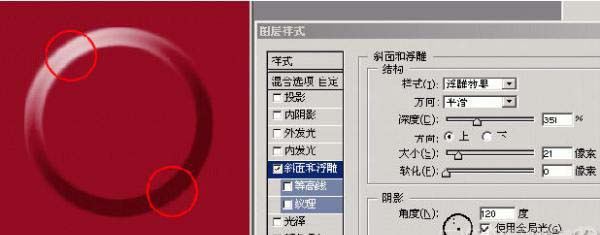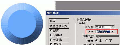 在這個例子中,圖層首先被賦予一個內(nèi)斜面樣式,形成一個突起的高臺效果,然后又被賦予一個外斜面樣式,整個高臺又陷入一個“坑”當(dāng)中,最終形成了如圖所示的效果。