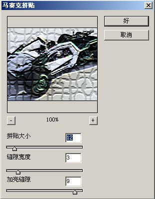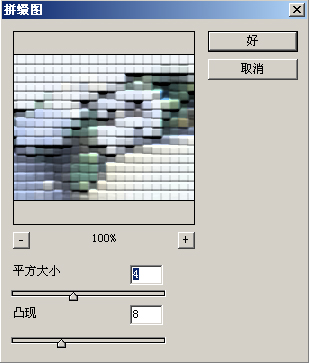 作用:使圖像看起來由方型的拼貼塊組成,而且圖像呈現(xiàn)出浮雕效果。