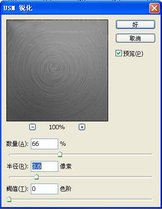 5、選擇菜單欄中的“濾鏡”“銳化”“USM銳化”命令,設置彈出的對話框如圖7所示。