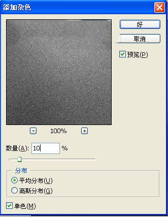 3、選擇菜單欄中的“濾鏡”“雜色”“添加雜色”命令,設置彈出的對話框如圖3所示。