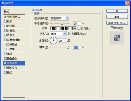 6、單擊“添加圖層樣式”按鈕,在彈出的下拉列表中選擇“漸變疊加”命令,設置彈出的對話框如圖9所示。