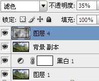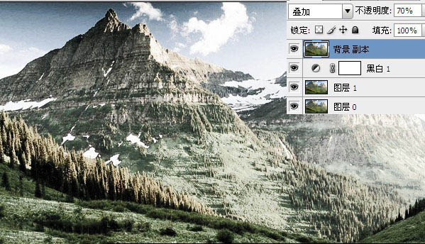 3、復制一層原圖,拉到黑白圖層上方,將圖層模式改為疊加,不透明度70%。
