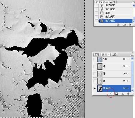 7、載入紅副本通道的選區,如下圖(點擊下面用紅圈所指的圖標),按住Ctrl單擊該通道。
