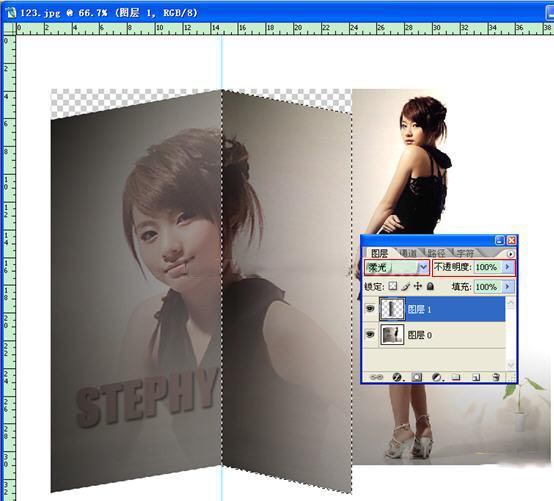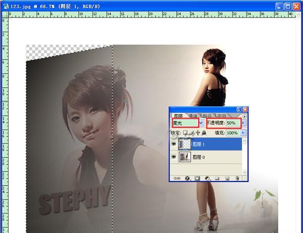 4、 這個時候設置剛建的層,混合模式為“柔光”,不透明度為“50%”,按ctrl+e向下合并圖層。