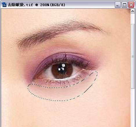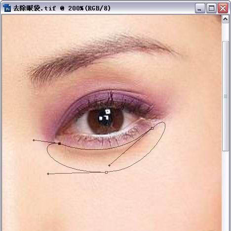 2、打開素材圖片,選擇工具箱中的【鋼筆工具】,單擊屬性欄上的【路徑】按鈕,在窗口中繪制路徑,選擇人物的眼袋部分如圖3所示: