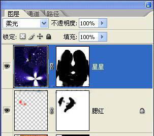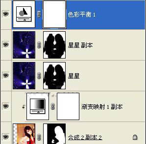 11、按住ctrl鍵單擊合成2副本2圖層中的蒙版,將人物選取調用出來,在"星星"圖層里添加蒙版,用同樣的方法將左邊的人物選區調用出來,在"星星"圖層的蒙版內填充黑色,完成后效果如圖12:
