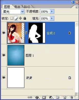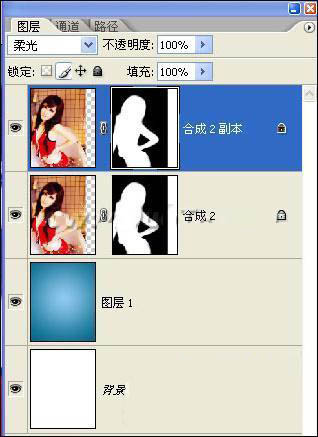 6、用磁性套索選擇人物后,羽化1-2個像素,給圖層"合成2"填加蒙版,將人物的背景隱藏(細節部分需要用畫筆工具,選擇黑色,進一步在圖層蒙版選中狀態下調整)并調整圖層的混合模式為柔光,完成后如圖7: