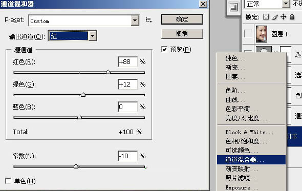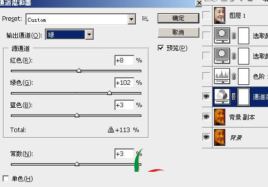 2、建通道混合器調整層,調整參數設置及效果如下圖: