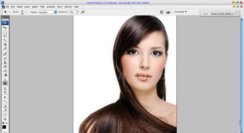 使用減淡工具,畫筆大小100,范圍:高光,曝光度30%,涂抹頭發,制作高光面。