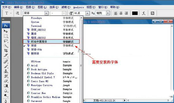 朋友們肯定會(huì)想,安裝在這邊以后 ps 里有這個(gè)字體么?回答是肯定的!如圖: