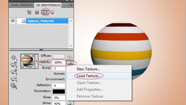 9.回到主場景,現在去的“窗口” > “3D 。選擇3D材料。選擇不透明度,并載入剛才的PSD文件。