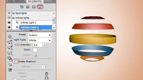 11.選擇燈光1和2,去掉陰影和增強一點強度。