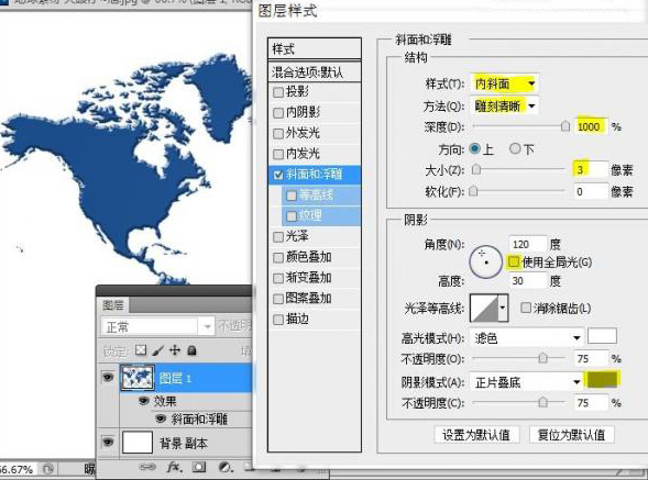 5.為了使地球看起來更加的逼真,我們為地球素材添加斜面浮雕樣式,參數如圖,效果如圖。