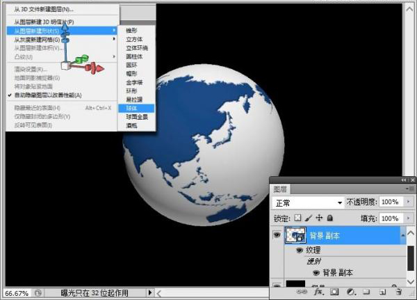 6.將圖層一和背景副本合并,執行3D,從圖層新建形狀,選擇球體,這樣我們就快速的得到了3D的地球效果。