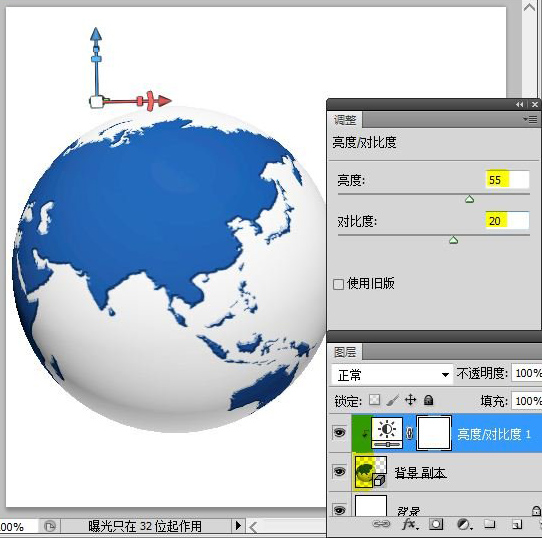 8.把剛才制作的3D地球文件放入新建的文檔當中,并調整大小。現在的地球效果有些偏暗,所以我們創建個亮度對比度,并按ALT鍵為其創建剪切蒙板,調整3D地球明暗效果,參數如圖,效果如圖。