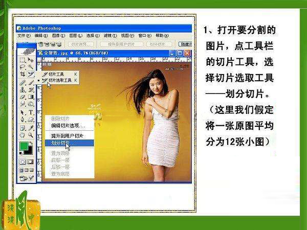 有朋友做網(wǎng)頁時(shí)曾經(jīng)問過我,如何將一張圖片分割成等分的幾張,我試了幾次,也咨詢過其他的朋友,發(fā)現(xiàn)切片工具很多人不太會(huì)用,現(xiàn)在我把這個(gè)切片工具寫出來,跟大家分享一下,如果寫得不對(duì),請(qǐng)大家別笑,因?yàn)槲乙膊唤?jīng)常用呢~~~湖湖一下,先看教程,不好,就請(qǐng)跟我一塊閃哦~~~~
