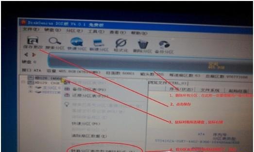 先使用分區工具(這里以diskgenius4.0為例),將所有分區全部刪除(此前必須提示用戶保存好資料),然后點【保存】,保存后在軟件左側用鼠標點擊硬盤右鍵,在彈出菜單中間位置有一項【轉換分區表類型為MBR模式】如圖