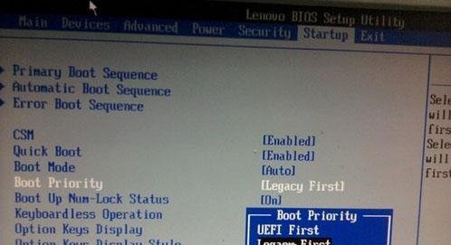 按F1進BIOS,橫向倒數第二選項(Startup),中下面有一項Boot Priority的選項,將其改成Legacy First,如圖
