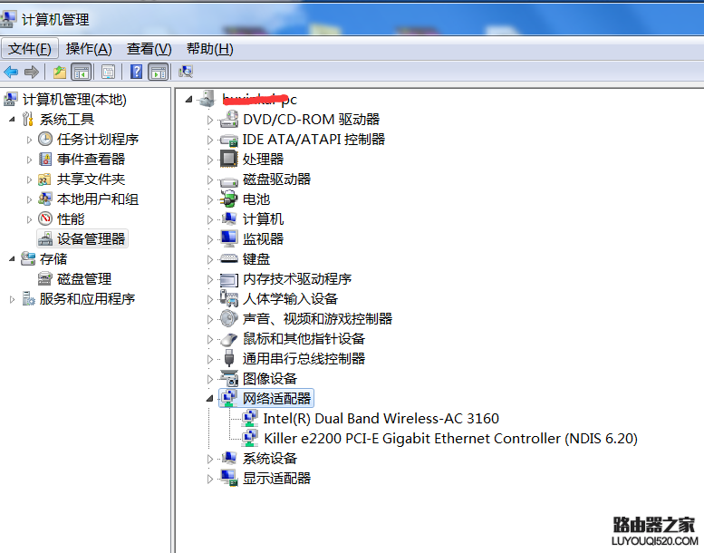 win7系統:“計算機”右鍵“管理”,找到“設備管理器”,找到“網絡適配器”
