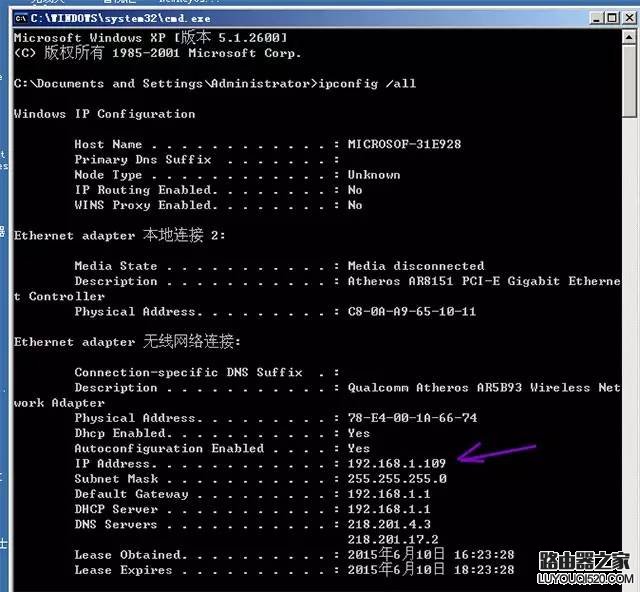輸入ipconfig /all 可以查看自己電腦獲取的ip地址,網關地址和DNS地址,這里是本機網絡是否健康的重要參數。